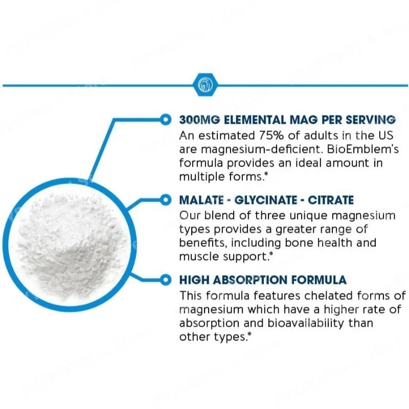 Answer 1: This supplement features a blend of Magnesium Glycinate, Malate, and Citrate. These three forms are chosen for their high absorption rates and work together to support muscle recovery, nervous system health, and overall energy production.
